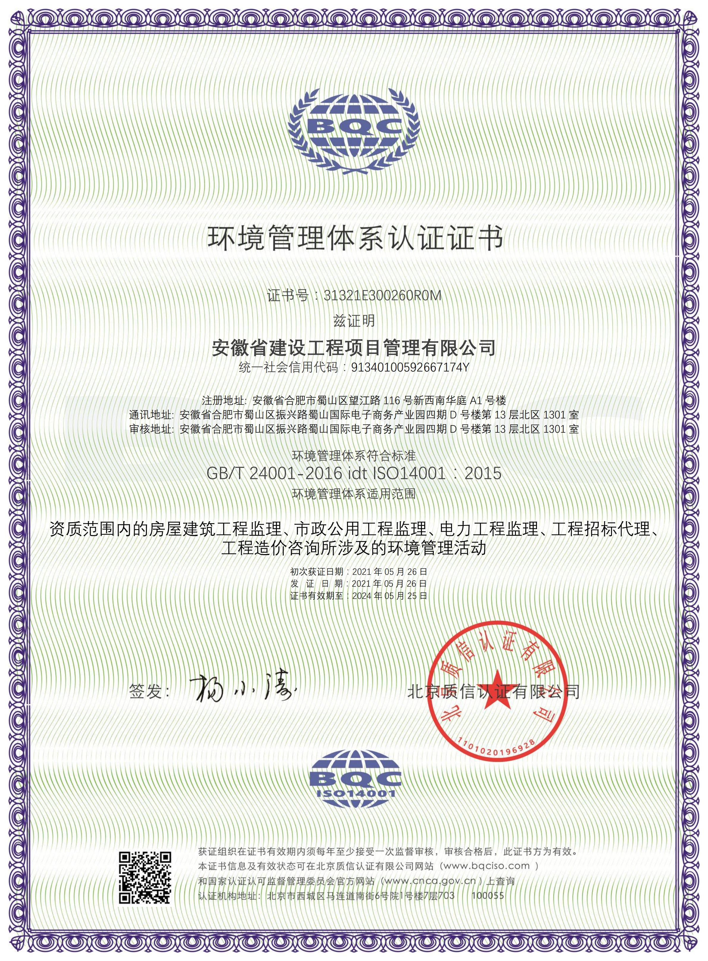 环境管理体系认证证书